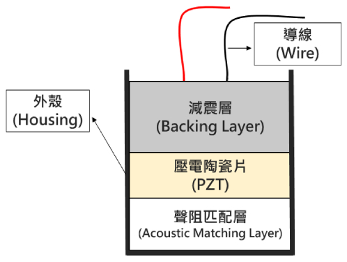 如图1所示,超声换能器由压电陶瓷、声学匹配层和阻尼层组成。压电陶瓷的主要成分是钛酸锆铅(PZT),两侧涂有导电层。通过施加高频交变电压,压电陶瓷可以通过反向压电效应(电能到机械能的转换)产生高频振动。高频振动是声波的一种。如果该声波的频率大于20kHz,那就是超声波振动。相反,超声波可以通过使用压电陶瓷的正压电效应(机械能到电能)来接收。